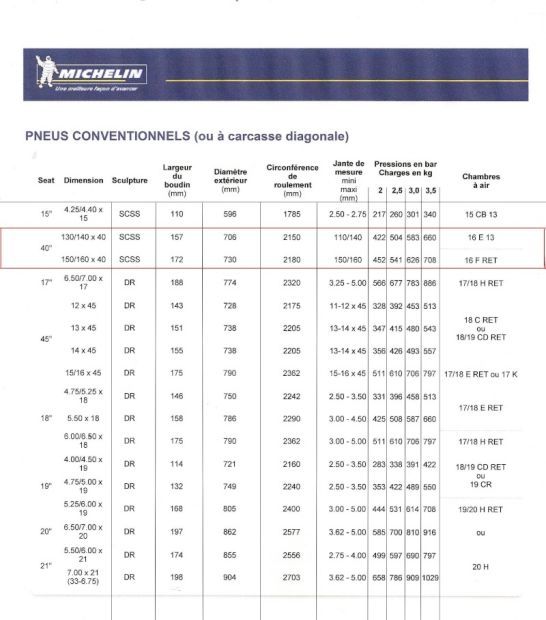 Les dimensions des pneus sont les suivantes :